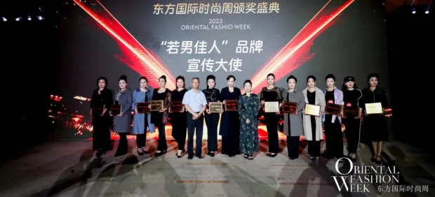 在东方国际时尚周颁奖盛典上,郑州市工商业联合会副会长、河南省服装协会常务副会长、河南若男佳人服饰有限公司褚立勋,朱仙镇文化旅游股份有限公司常务副总裁沈建荣,赛美国际时尚美学职业教育创始人刘赛,启封故园总经理郭广达为“若男佳人”品牌宣传大使颁发奖牌。