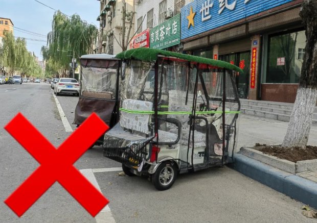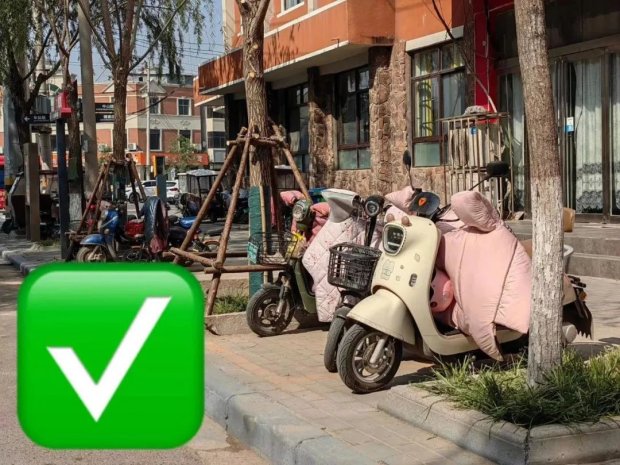 所有骑行人员应将非机动车车头统一朝外(朝道路方向)停放,不得占用盲道。