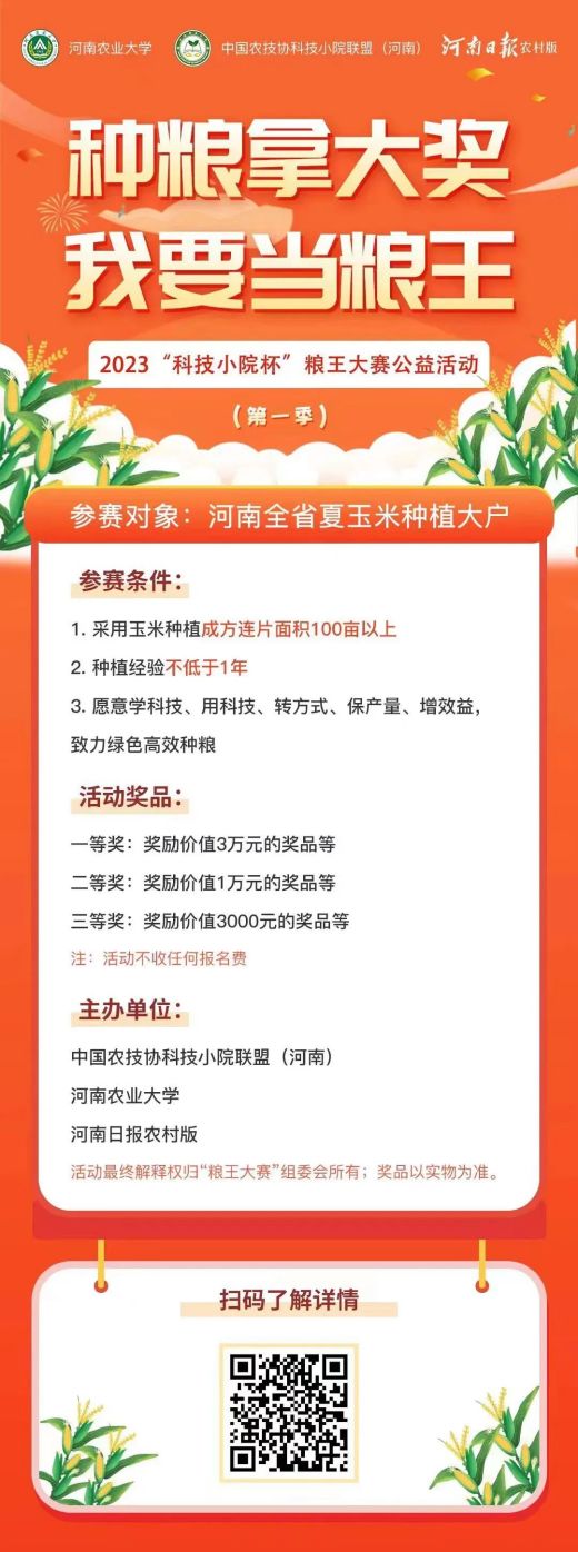 河南农业大学、中国农技协科技小院联盟(河南)与河南日报农村版联合多家涉农部门、科研院校举办的2023“科技小院杯”粮王大赛公益活动将于近日拉开帷幕。“一等奖是价值3万元的奖品,除了奖品外,河南科技小院