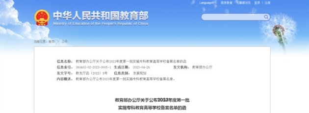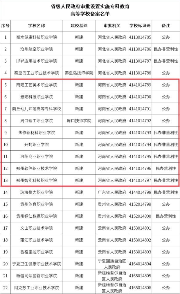 日前,教育部公布2023年度第一批实施专科教育高等学校备案名单,22所高校在列。22所高校中,9所高校位于河南省。其中,8所高校为新建,包括南阳工艺美术职业学院、濮阳科技职业学院、商丘幼儿师范高等专科