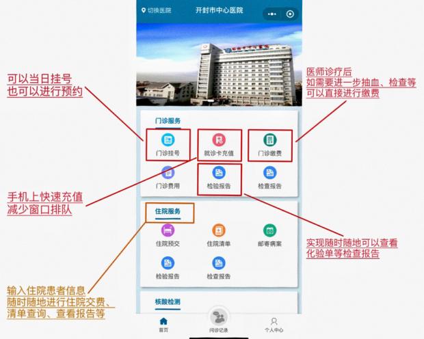 为了给广大患者提供更优质的服务,开封市中心医院智慧医院小程序持续优化线上功能,从预约挂号、住院预缴,到查阅报告、线上咨询......为广大患者提供更加便捷的线上服务,努力增加患者就诊体验。一、关注应用