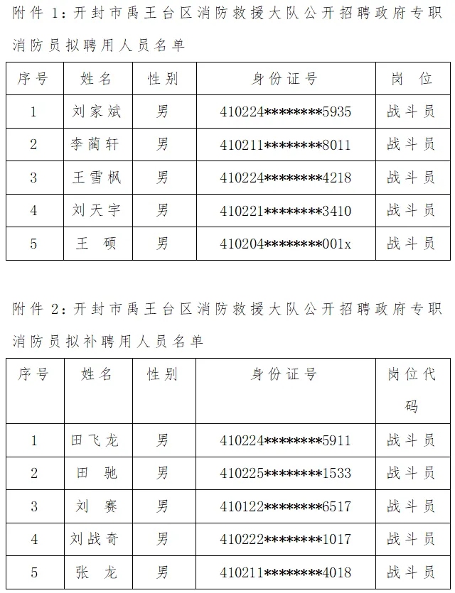 根据《2024年禹王台区消防救援大队政府专职消防员招聘公告》,经体能测试、体检、面试、政审,开封市禹王台区消防救援大队公开拟聘用政府专职消防员5名。现将拟聘用人员情况公示如下,拟补聘人员将根据工作和人