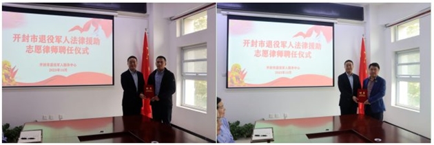 10月18日,开封市退役军人服务中心举行退役军人法律援助志愿律师聘任仪式,市法律援助中心四级调研员、主任张榕,市退役军人服务中心主任鲁腾飞,市司法局法律援助科副科长赵卫华及市退役军人服务中心各科室负责