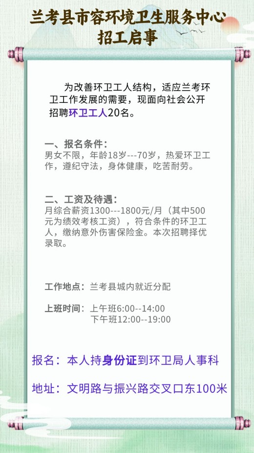 注意:报名时本人持身份证到环卫局人事科(兰考县文明路西段)报名。