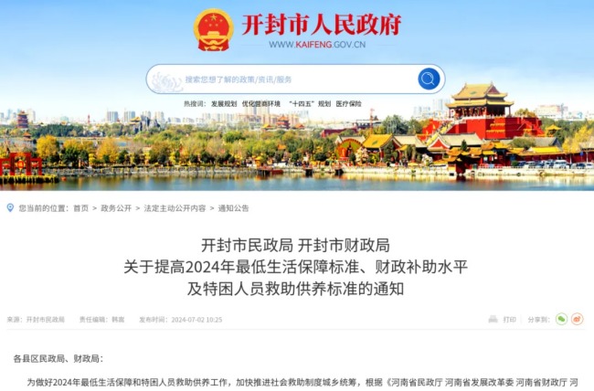 近日,经开封市人民政府同意,开封市民政局、开封市财政局印发通知,提高2024年城乡最低生活保障标准、财政补助水平和特困人员救助供养标准。