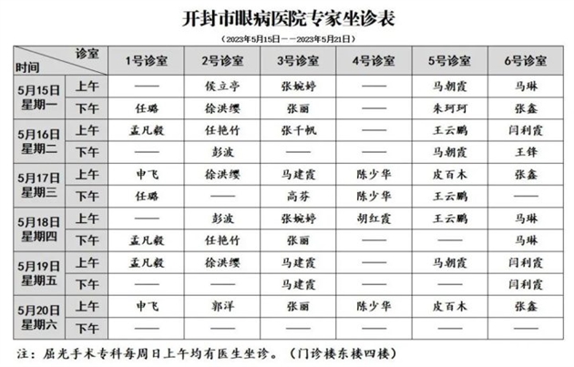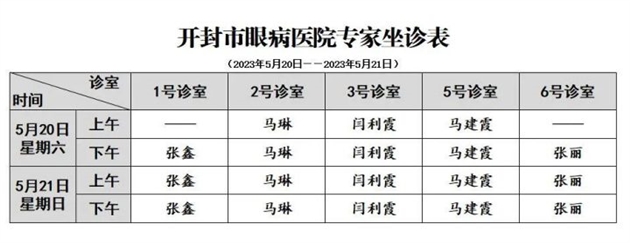 【小程序可来约】开封市眼病医院2023年5月15日—2023年5月21日门诊专家坐诊表