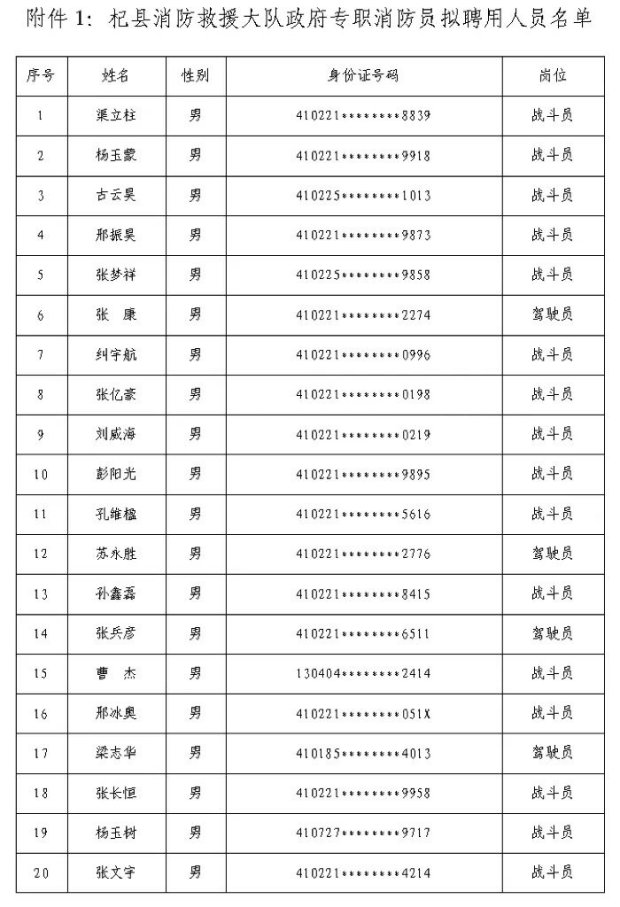 按照《2023年杞县消防救援大队政府专职消防员招聘公告》,经体能测试、体检、面试、政审等环节,杞县消防救援大队公开招聘政府专职消防员拟聘用20名,现将拟聘用人员名单进行公示。公示时间:2023年10月