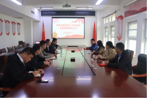 10月18日,开封市退役军人服务中心举行退役军人法律援助志愿律师聘任仪式,市法律援助中心四级调研员、主任张榕,市退役军人服务中心主任鲁腾飞,市司法局法律援助科副科长赵卫华及市退役军人服务中心各科室负责