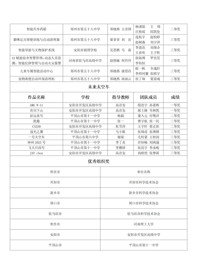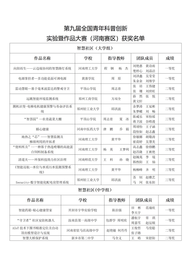 由河南省科协主办、河南省科技馆承办的第九届全国青年科普创新实验暨作品大赛(河南赛区)复赛已于2023年5月25日圆满结束。经过初赛、复赛两轮评审,智慧社区命题大学组评出一等奖2组,二等奖3组,三等奖7