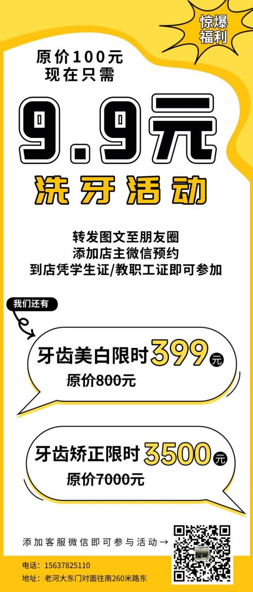 老校区东门附近谷萌口腔诊所给大家送福利啦!凭学生证/教职工证洗牙限时9.9元!更有牙齿美白、牙齿矫正限时特价,不要错过!