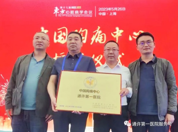 2023年5月26日,全国省、地市胸痛中心联盟研讨会在上海召开,通许第一医院荣获“中国胸痛中心(标准版)”认证奖牌。通许第一医院胸痛中心“四大心内专家”王洪涛、王东生、于大印和李红磊赶赴上海世博中心捧