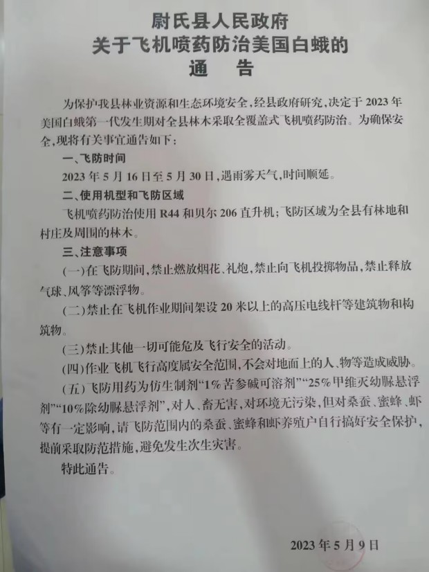 为保护我县林业资源和生态环境安全,经县政府研究,决定于2023年美国白蛾第-代发生期对全 县林木采取全覆盖式飞机喷药防治。为确保安全,现将有关事宜通告如下:一、飞防时间2023年5月16日至5月30日