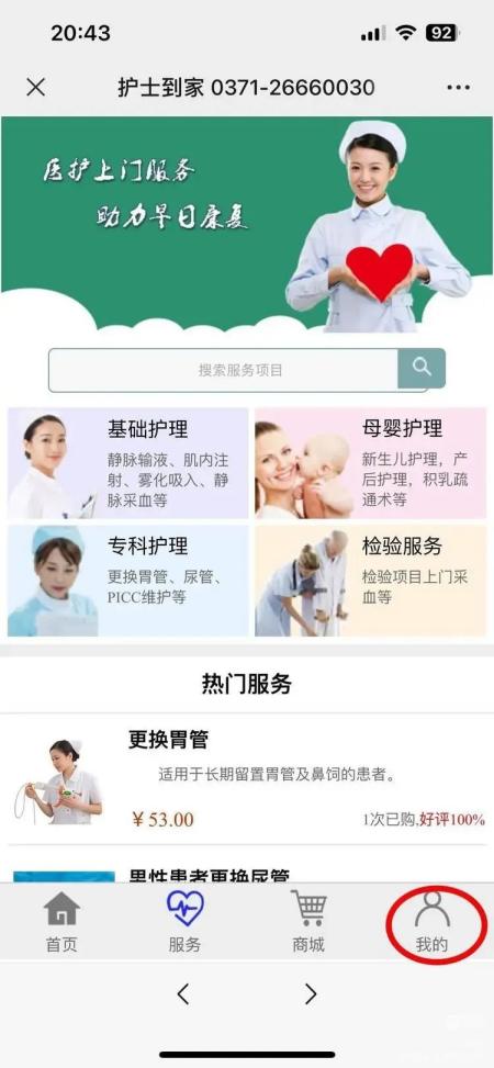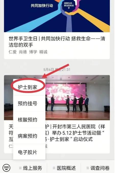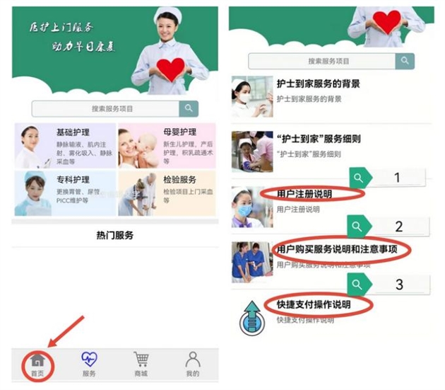 第一步:微信关注开封市第三人民医院公众号第二步:点击左下方菜单线上服务—护士到家第三步:点击左下方“首页”,阅读用户注册说明、用户购买服务说明和注意事项、快捷支付操作说明第四步:点击右下方“我的”第五